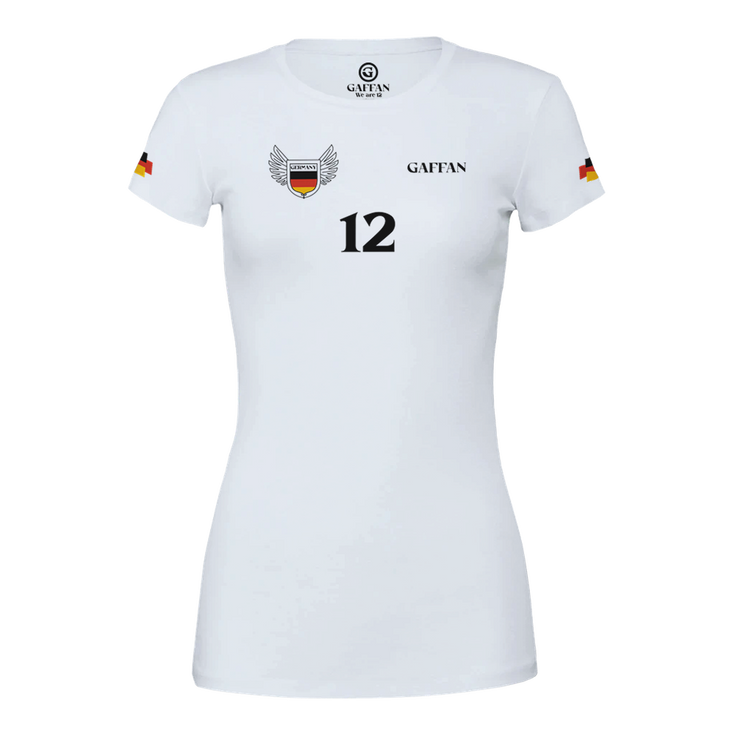 This stylish women’s Germany national soccer shirt features the classic white design with contrasting black, red and gold tones and the symbol of German heritage, the eagle, evoking the country’s richest traditions.